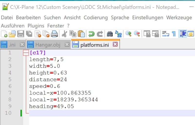 Dein pad muss genauso zum Hangar stehen wie es rein fahren soll. Hatte vorher auch so meine bedenken ob das jemals bei mir klappt. Deine Daten in der platform.ini sind auch sehr wichtig. Ich hoffe, ich konnte Dir weiter helfen.