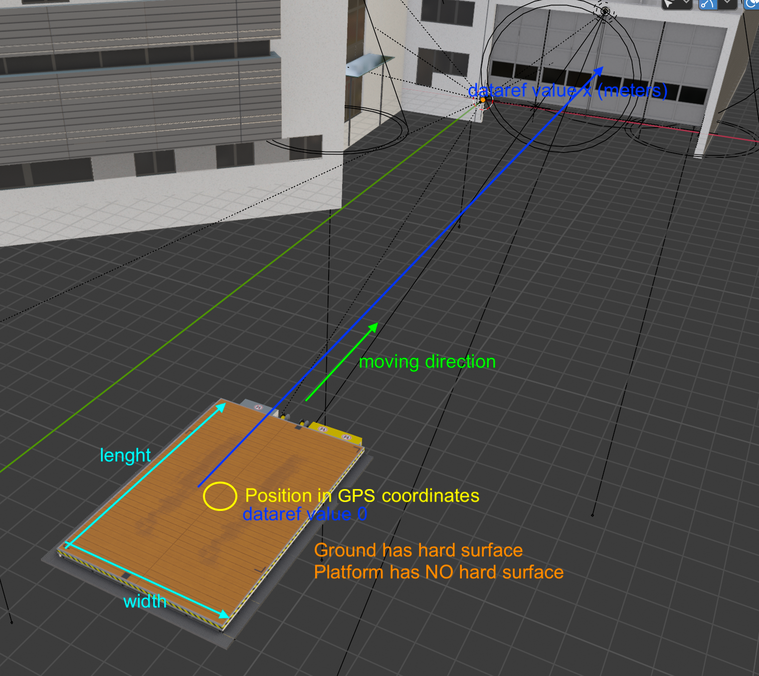 The values for the size and height of the platform help the plugin to determine whether a skid element is above the platform or even touches it. The heading value is also used for this calculation. If the values entered do not match those of the animated object, the helicopter and the platform may move differently. In other words: The object, in conjunction with its animation dataref, determines where the platform is seen in the scenery. The plugin uses the description of the platform to determine where the helicopter moves when it is on the platform and whether it is correctly recognized on the platform.